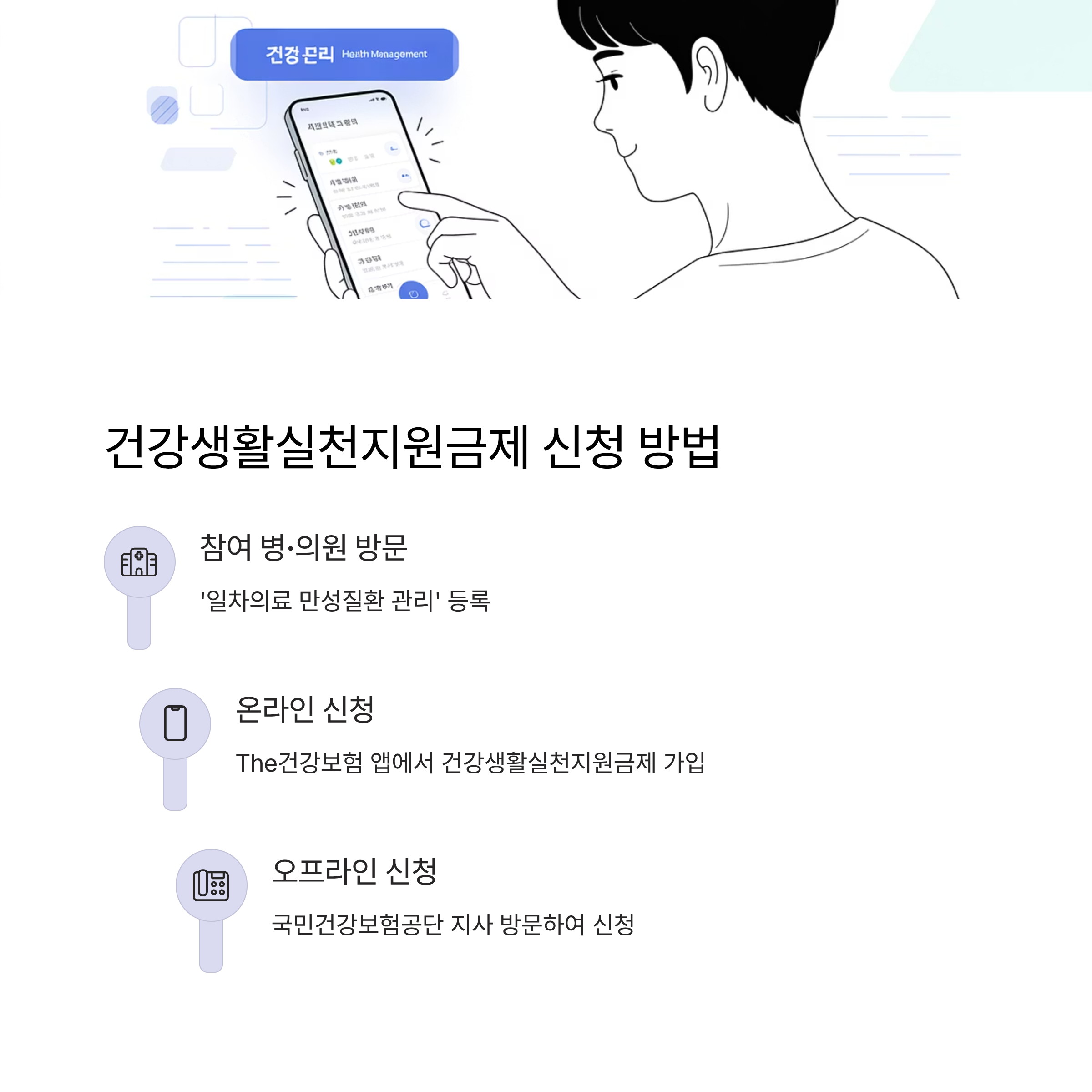 - 거주 지역 보건소·주민센터 또는 국민건강보험공단에서 지원사업 여부 확인