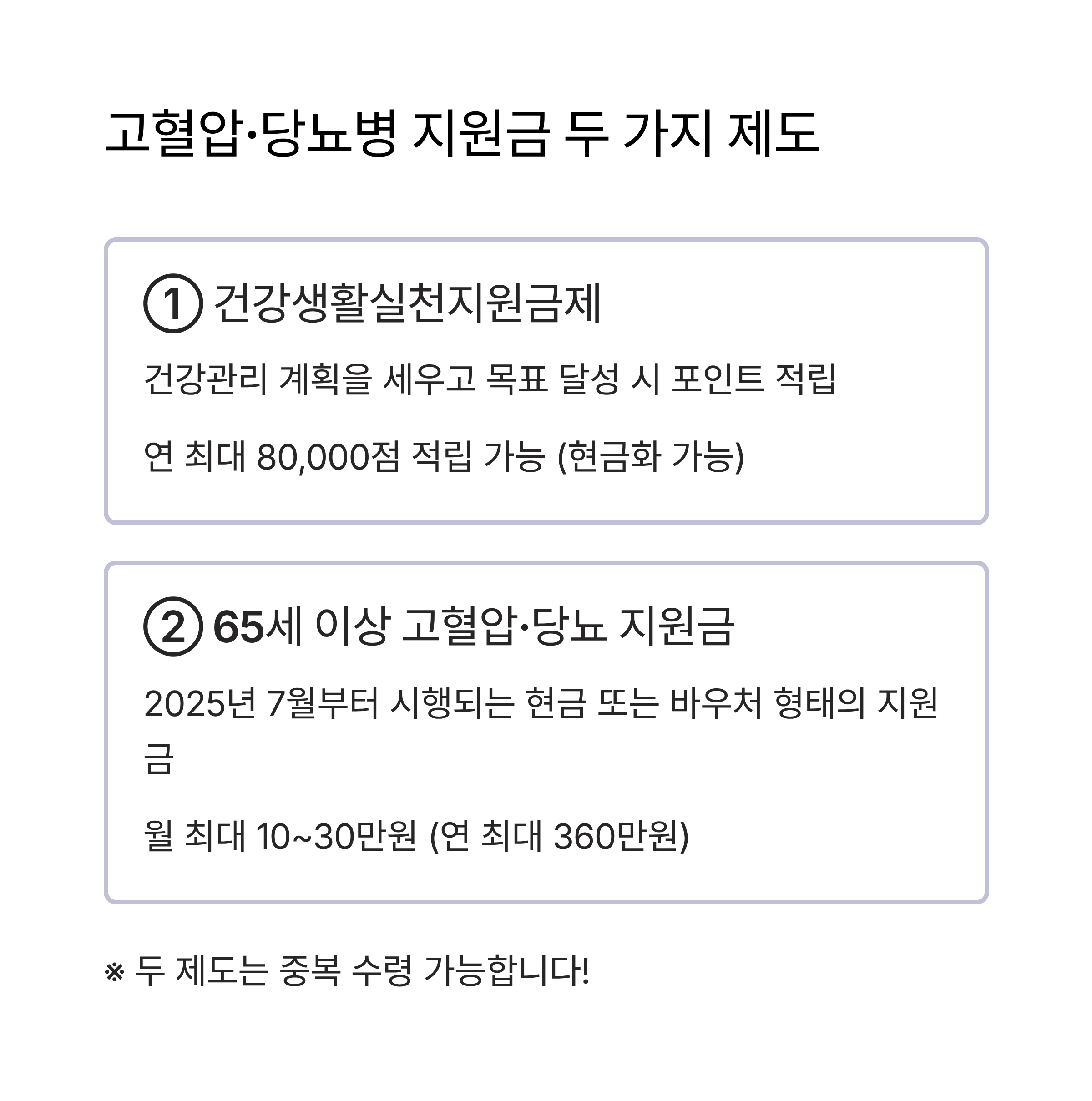 고혈압과 당뇨병은 평생 관리가 필요한 대표적인 만성질환입니다. 최근 정부와 지자체에서는 건강생활실천지원금제와 65세 이상 고혈압·당뇨 지원금을 통해 환자들의 경제적 부담을 줄이고 꾸준한 건강관리를 유도하고 있습니다.