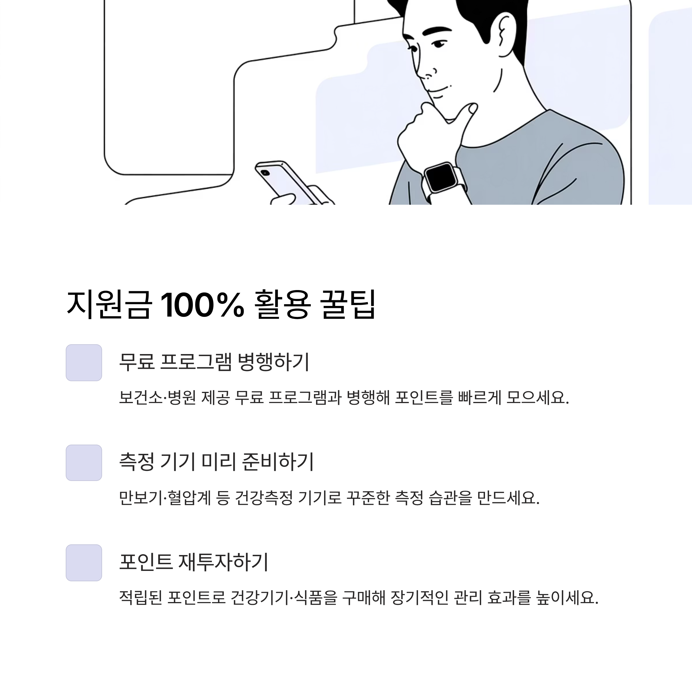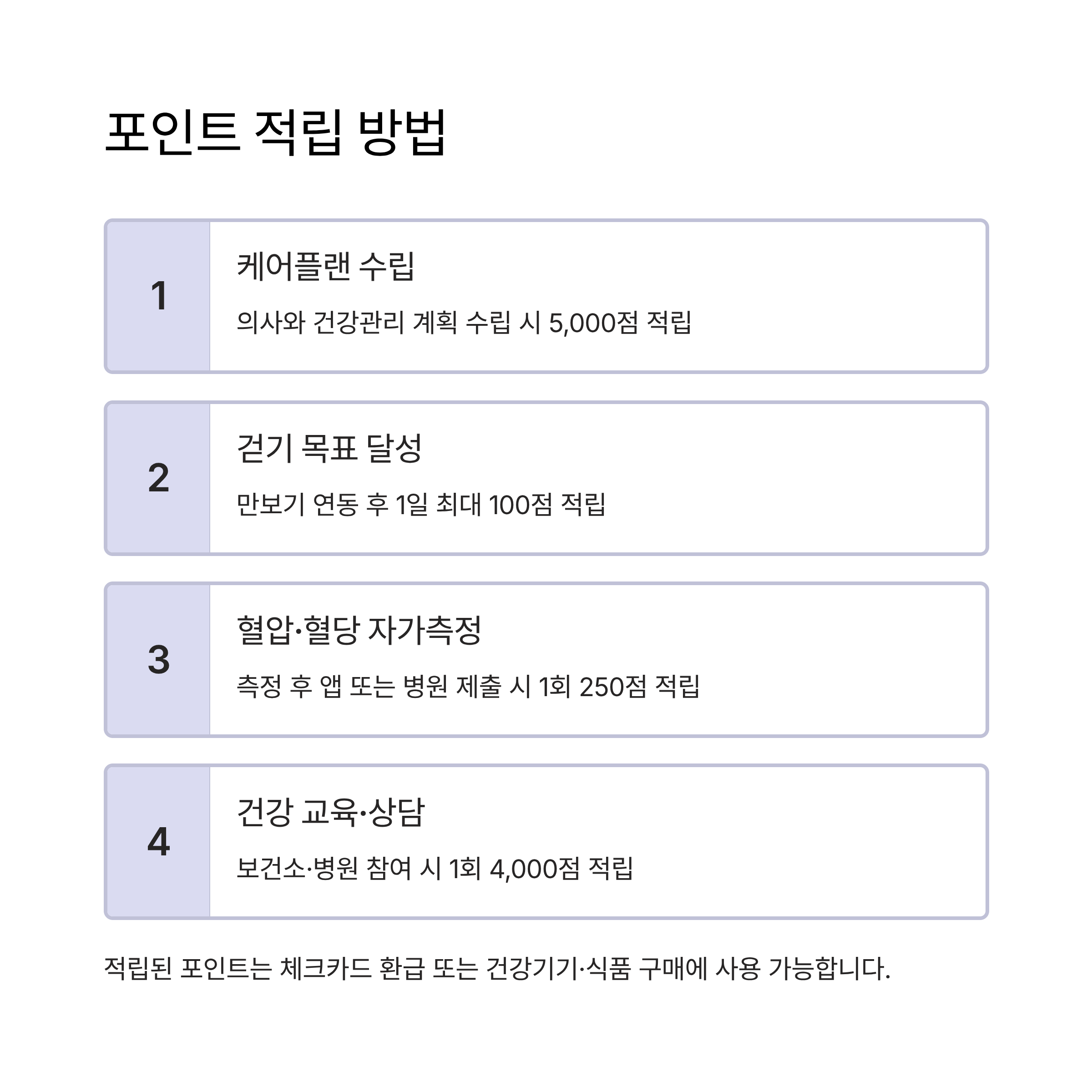 - 보건소·병원 제공 무료 프로그램과 병행해 포인트를 빠르게 모으기