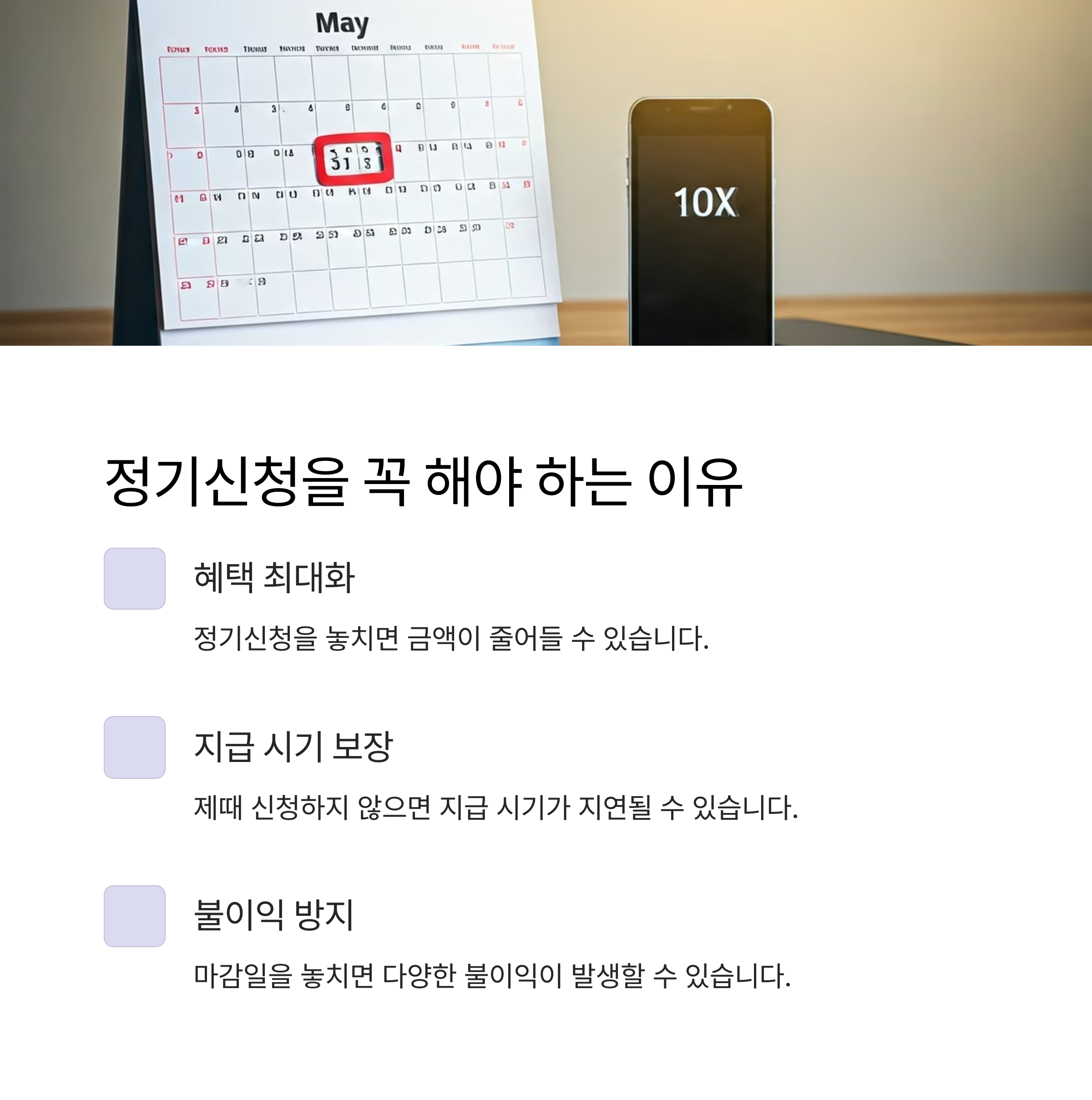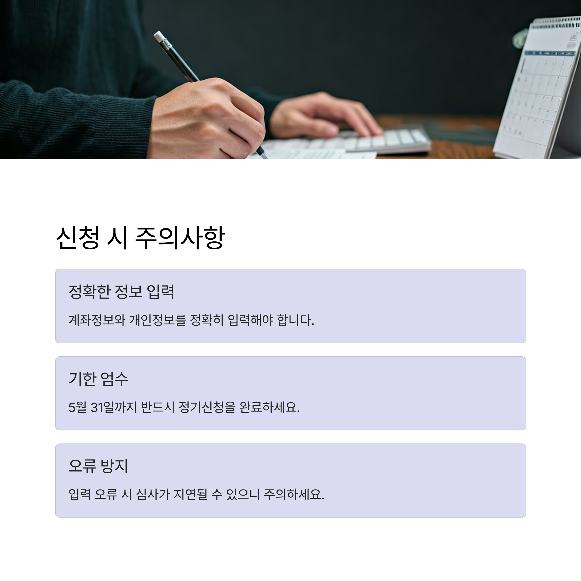 | 총소득 및 재산 기준 충족 필수 | 5월 31일까지 정기신청 권장 | 입력 오류 시 심사 지연 가능 |