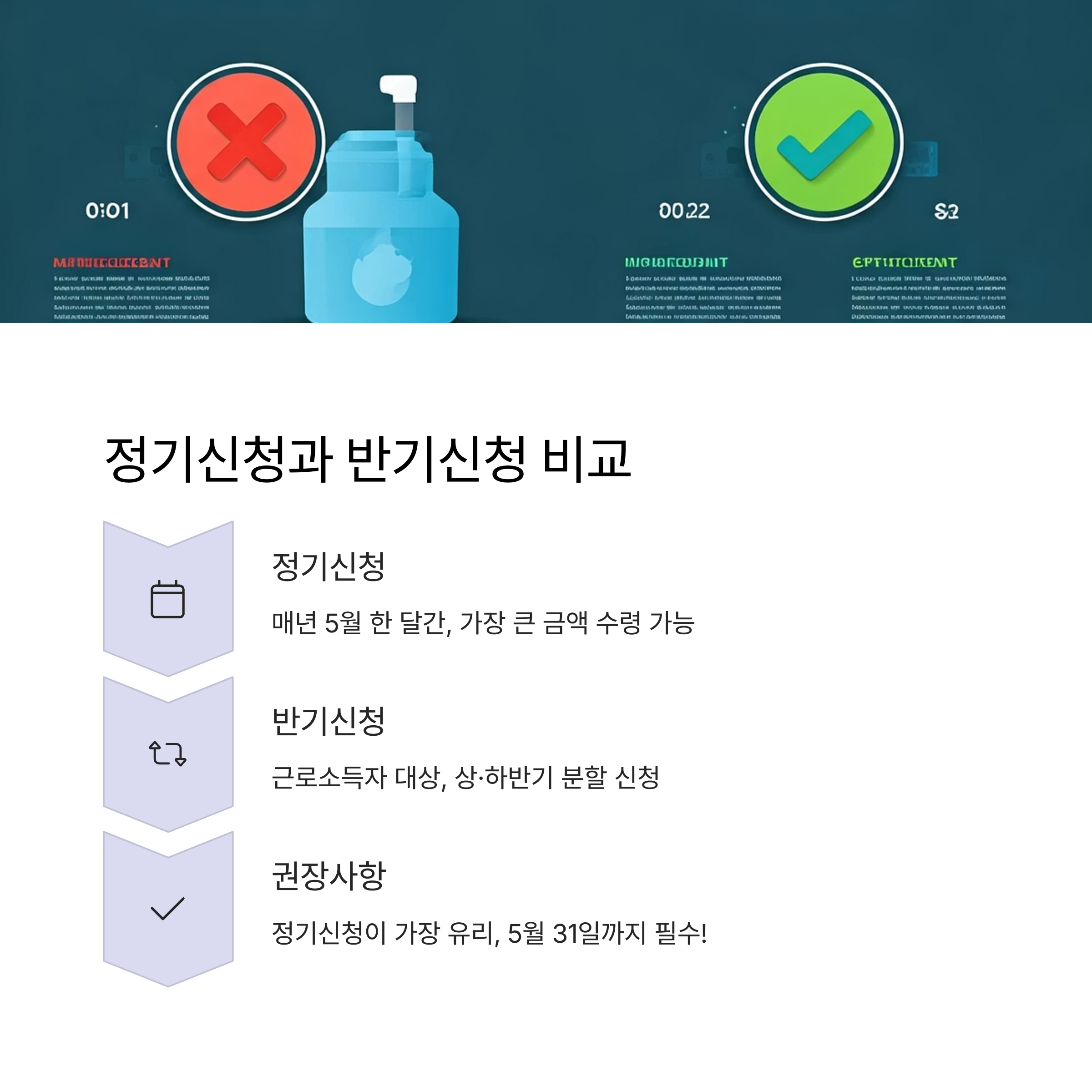 정기신청은 매년 5월 한 달간 진행되며, 가장 큰 금액을 받을 수 있는 기본적인 신청 방식입니다. 반면 반기신청은 근로소득자 대상이며, 상반기·하반기 나눠 분할 신청하는 방식으로, 지급 시기와 금액에서 일부 차이가 있습니다. 신청자의 상황에 따라 선택 가능하지만 정기신청이 가장 유리하므로 반드시 기한을 확인해야 합니다.