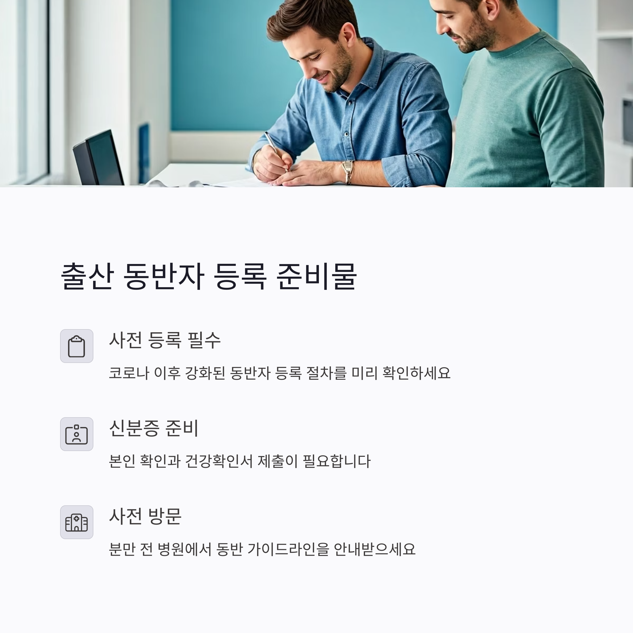 대부분의 분만병원은 코로나 이후 위생 문제로 출산 동반자 사전 등록 제도를 운영하고 있습니다. 출입증 발급, 코로나 검사 결과 제출, 동의서 작성 등 생각보다 복잡한 절차가 많아 사전 준비가 필요합니다. 보통 출산 2~3주 전에는 병원과 상담 후 등록 절차를 진행해야 하며, 출산 당일엔 신분증과 출입팔찌를 꼭 지참해야 합니다.