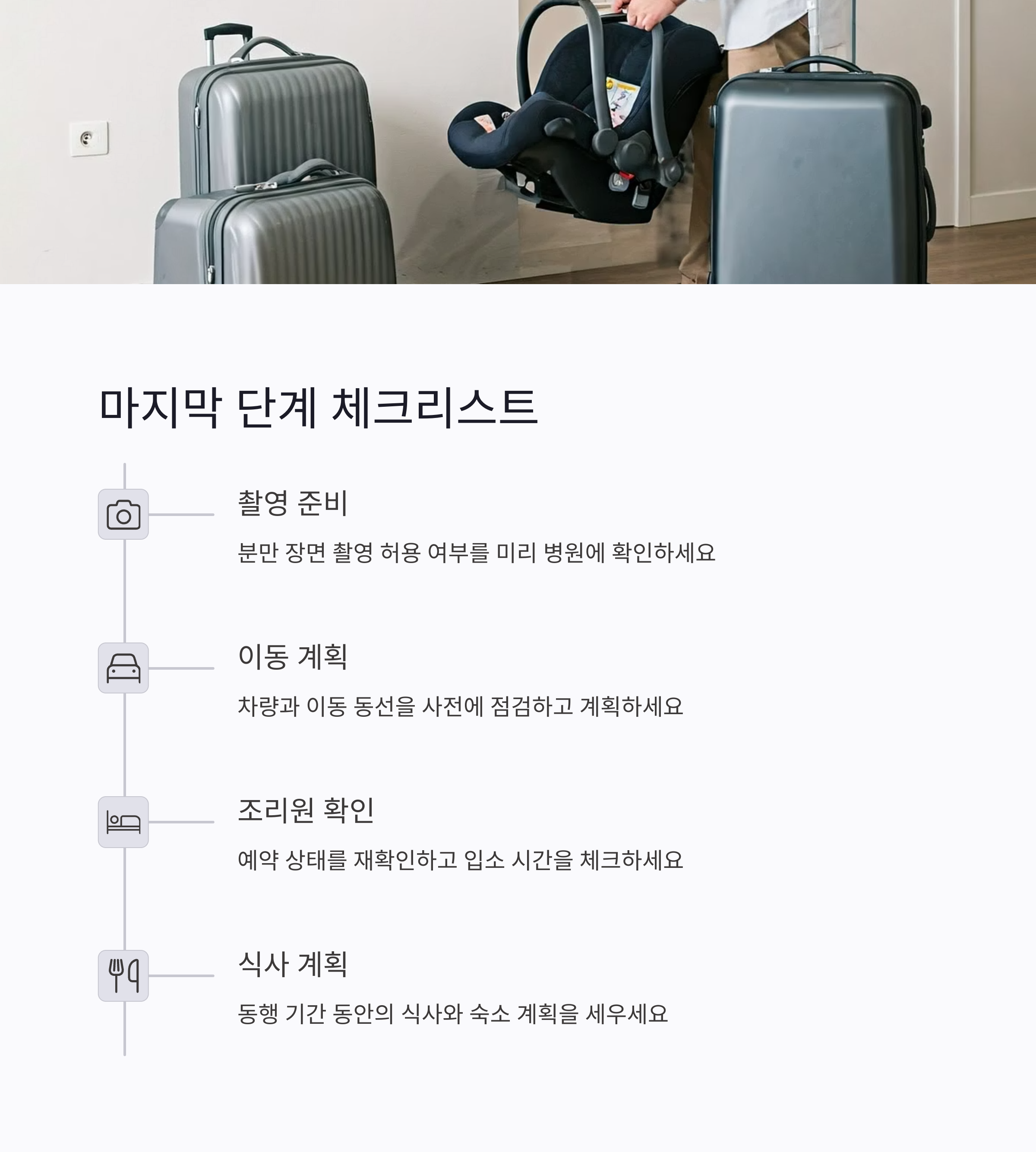 출산 후 바로 조리원으로 이동하는 경우, 차량 동선 확인과 짐 이동, 입소 시간 체크도 남편이 맡아야 할 부분입니다. 특히 겨울철이나 야간 출산의 경우 아기 보온용품, 유모차 등 이동 준비물은 꼭 사전에 점검해두세요. 출산 직후엔 아내가 움직이기 힘들기 때문에 모든 짐과 절차는 남편이 책임진다는 생각으로 움직이는 게 좋습니다.