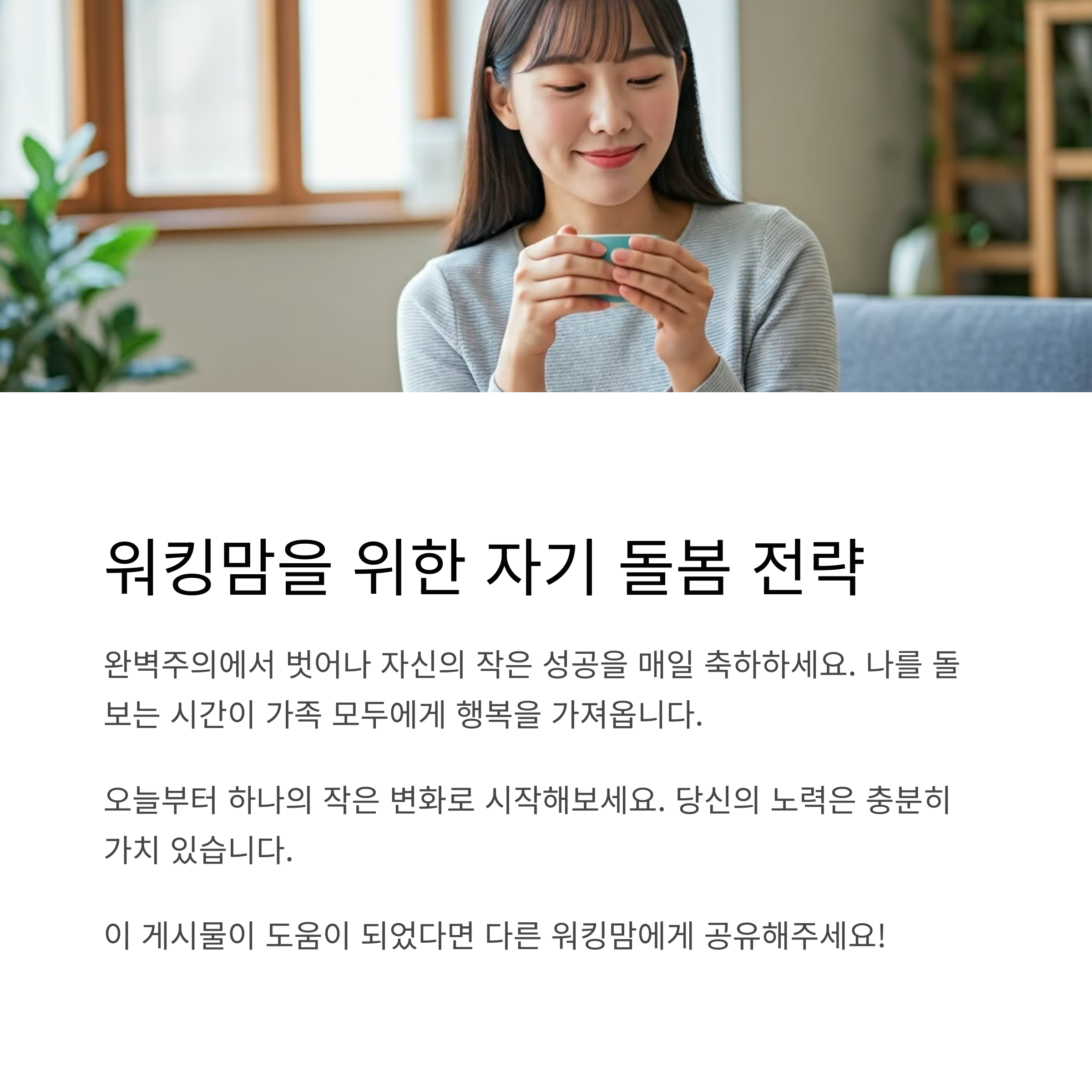 실천 중인 워킹맘 루틴이나 실패와 성공의 경험담이 있다면 댓글로 함께 나눠주세요. 여러분의 이야기가 누군가에게는 큰 위로와 도움이 됩니다.