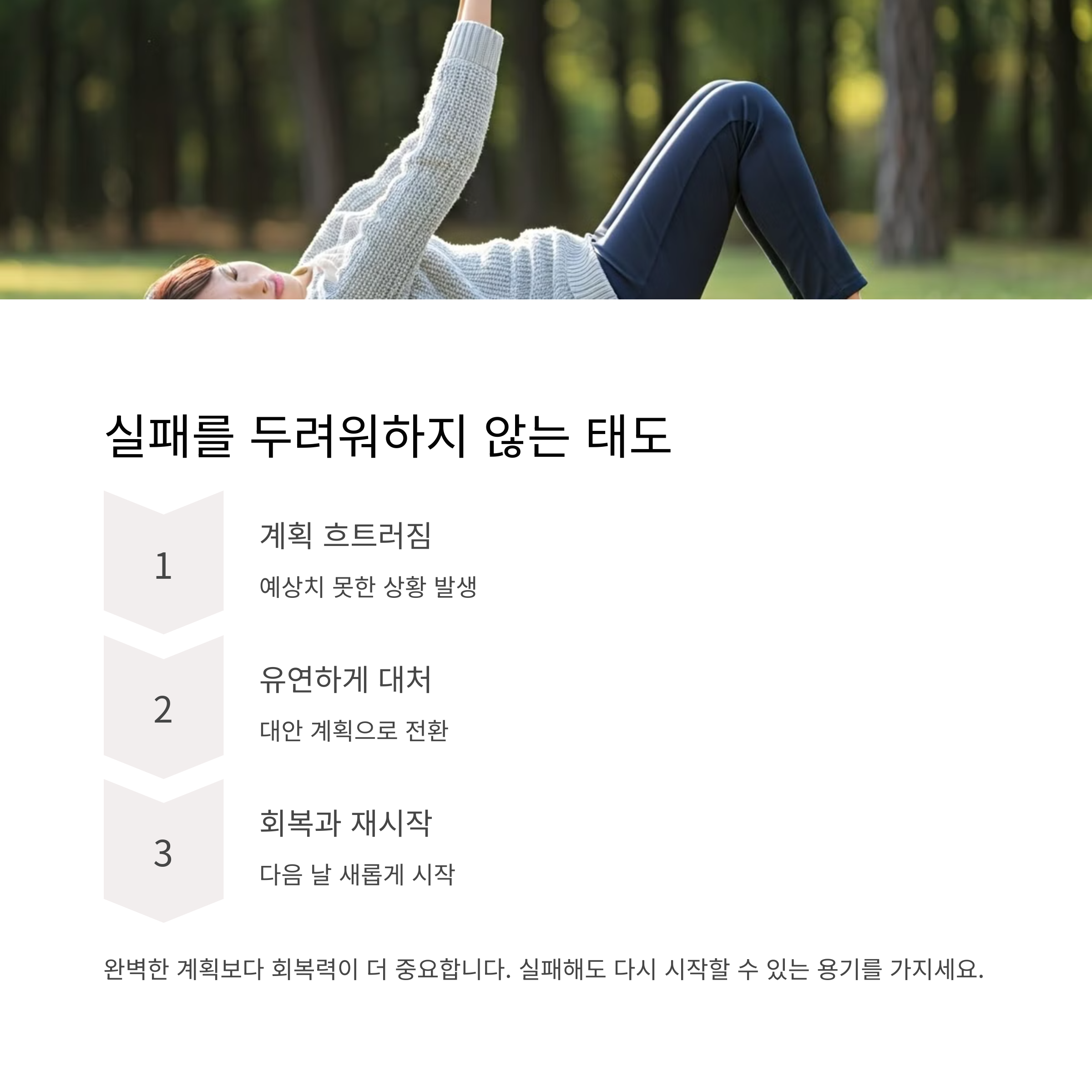 두 번째 팁은 '실패해도 괜찮다는 마음 갖기'입니다. 처음부터 완벽한 시간표를 만들려고 하면 부담이 크고 중간에 흐트러지면 자책하게 됩니다. 워킹맘 시간표는 '지키는 것보다 유지하는 흐름'이 핵심입니다. 아이 컨디션, 업무 일정에 따라 유연하게 바꾸고 흐름이 무너지더라도 다시 돌아오면 된다는 마음가짐이 중요합니다. 자기만의 리듬을 찾기까지 시간은 필요하며, 그 자체가 엄마와 아이의 생활 균형을 만들어줍니다.