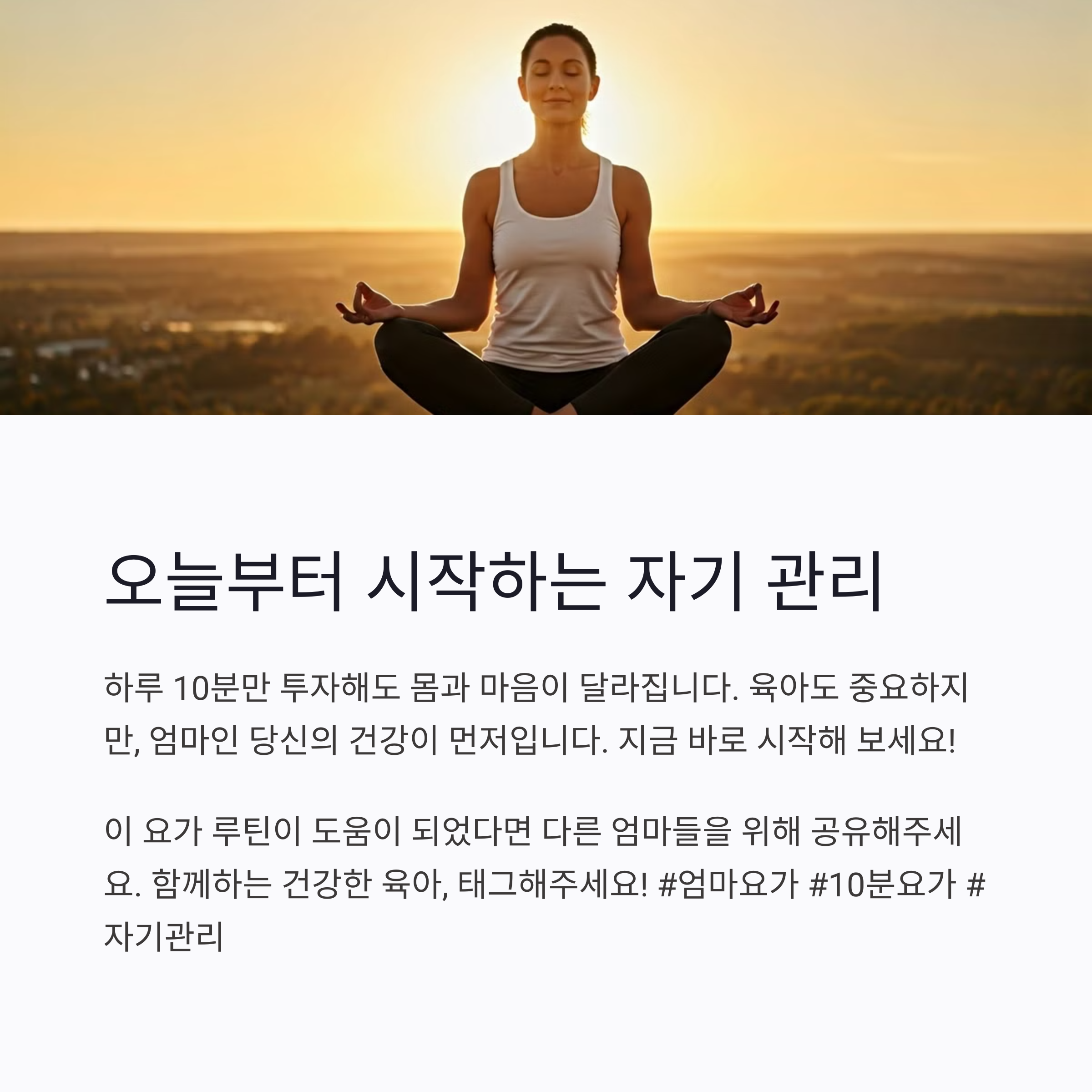 | 10분 스트레칭, 명상, 자세 교정 포함 | 반복되는 육아 피로를 해소하는 루틴 | 나를 위한 소중한 루틴 형성 |