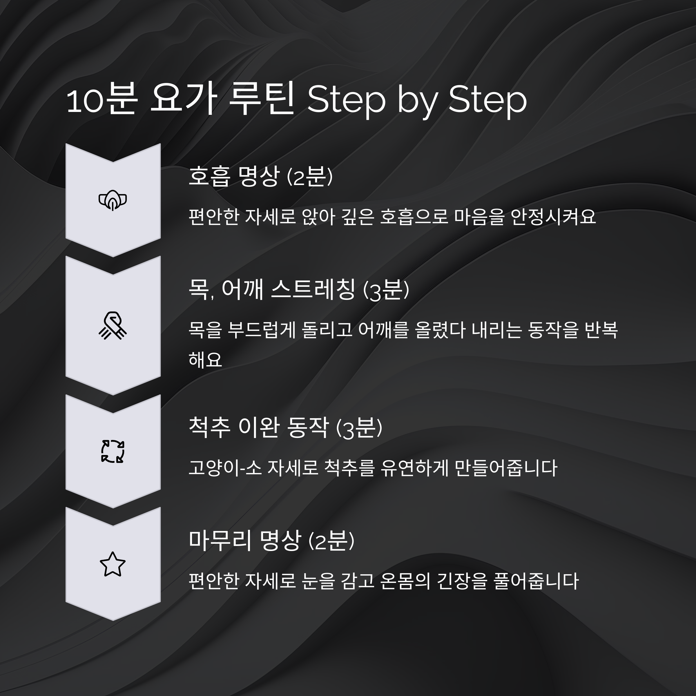 오늘 소개할 요가 루틴은 총 10분 분량으로 '고양이-소 자세', '아이 자세', '다운독', '호흡 명상' 등 누구나 쉽게 따라할 수 있는 동작들로 구성되어 있습니다. 특히 이 루틴은 척추의 긴장을 풀고, 골반 주변을 이완시켜 하루 종일 아이를 안아주느라 뻐근한 몸에 즉각적인 효과를 줍니다. 동작 사이사이 깊은 복식 호흡을 넣으면 자율신경 안정에도 탁월합니다. 중요한 것은 완벽하게 따라하는 것이 아니라 ‘지금 이 순간 나를 돌아보는 시간’을 갖는 것입니다.