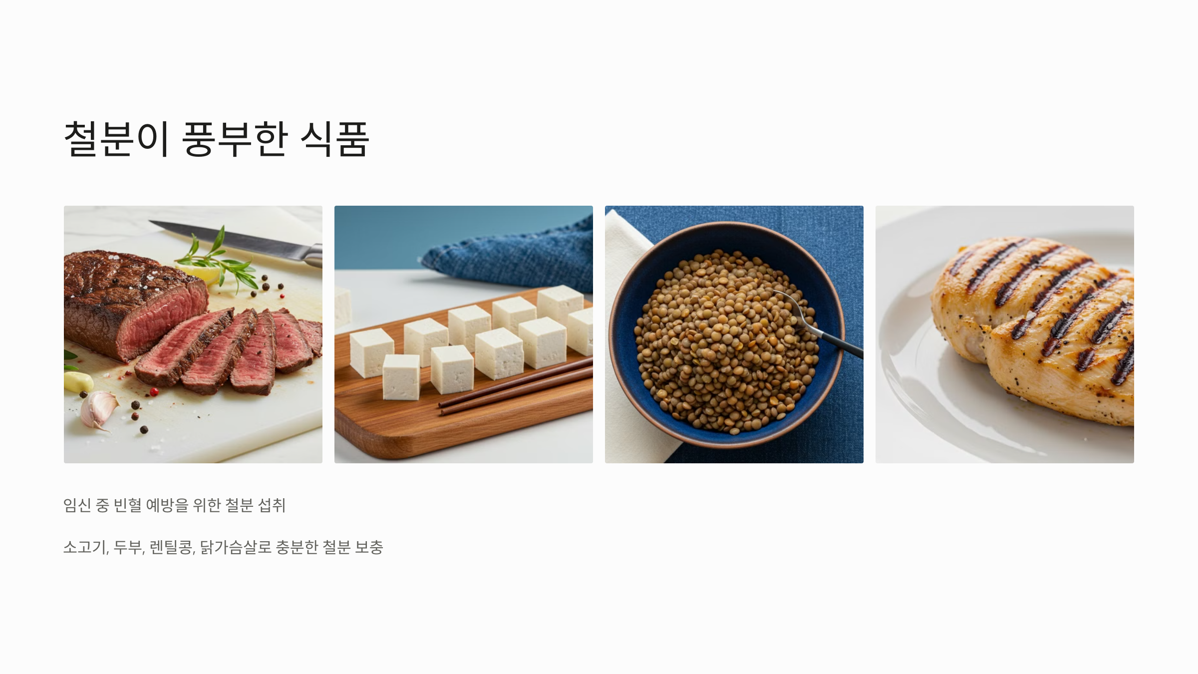 - 철분이 많은 음식: 소고기, 닭고기, 두부, 렌틸콩