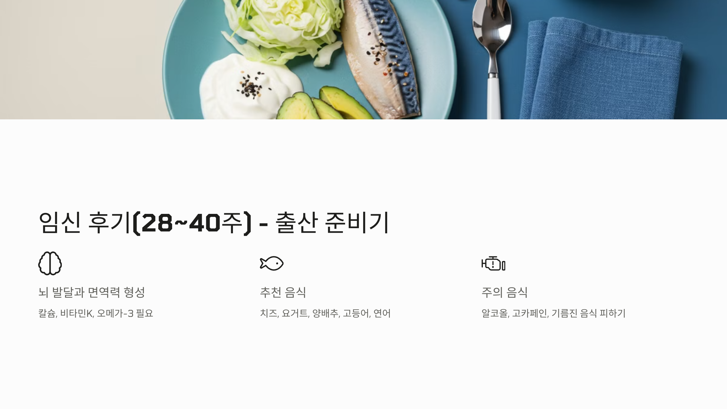 - 오메가-3 (태아 두뇌 발달): 고등어, 연어, 아보카도