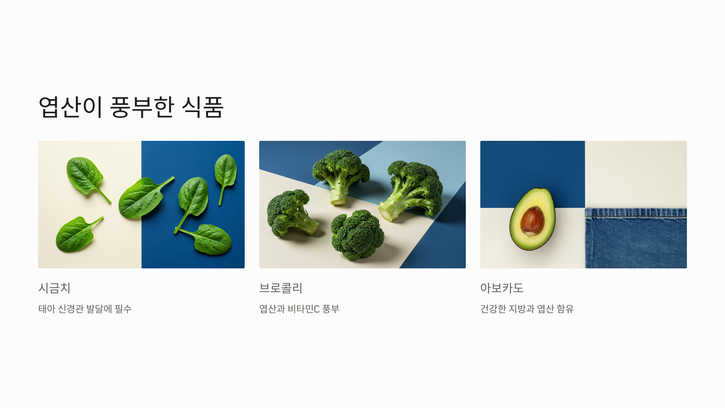 - 엽산이 풍부한 음식: 시금치, 브로콜리, 아보카도, 계란