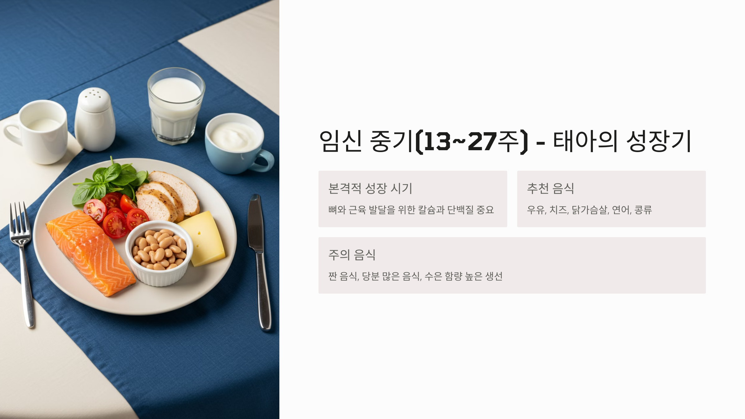 임신 중기는 태아가 본격적으로 성장하는 시기이며, 뼈와 근육 발달을 돕는 칼슘과 단백질이 중요합니다.