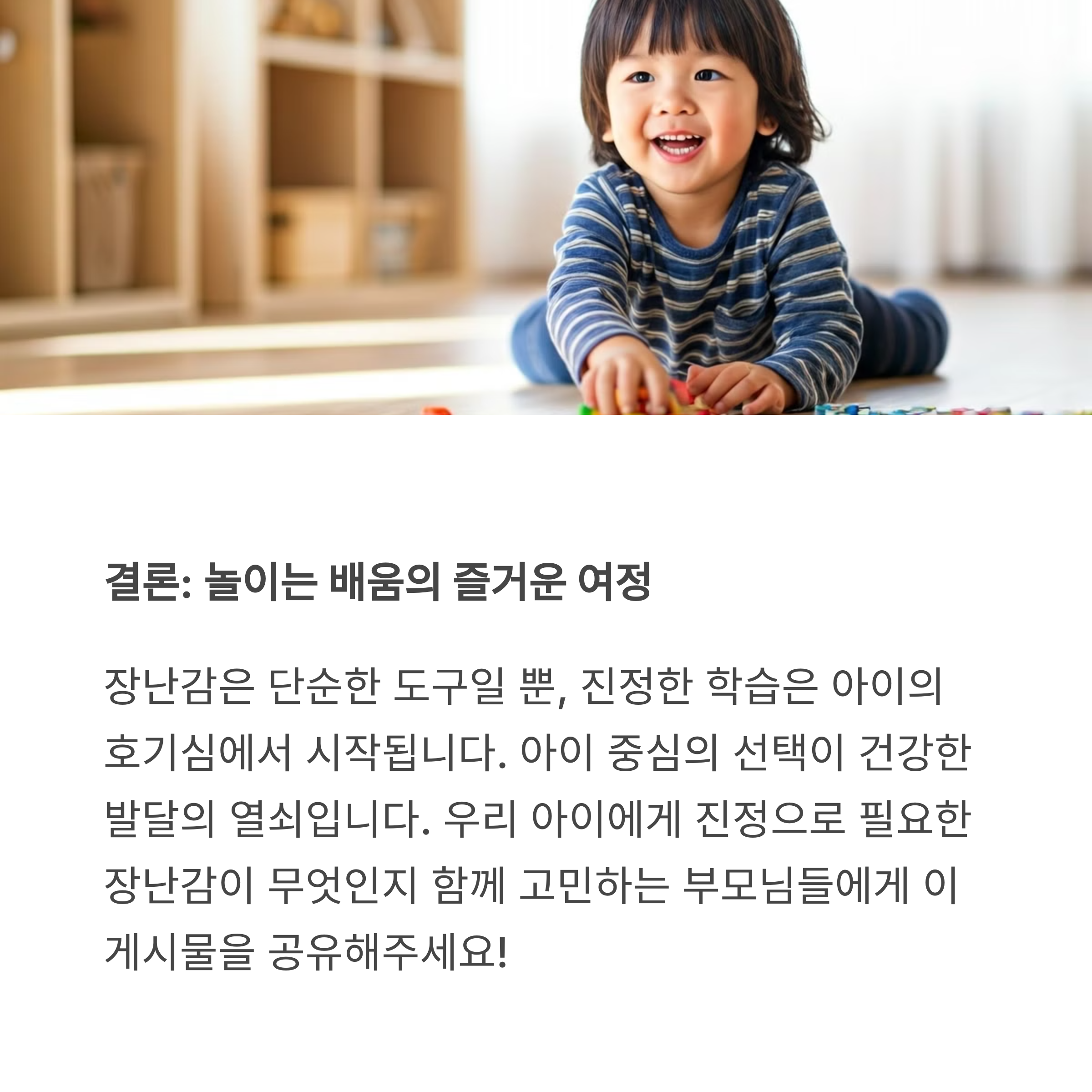 | 아이의 현재 능력보다 약간 높은 수준 | 함께 고르는 과정이 교육이 됨 | 학습보다 놀이 중심이 효과적 |