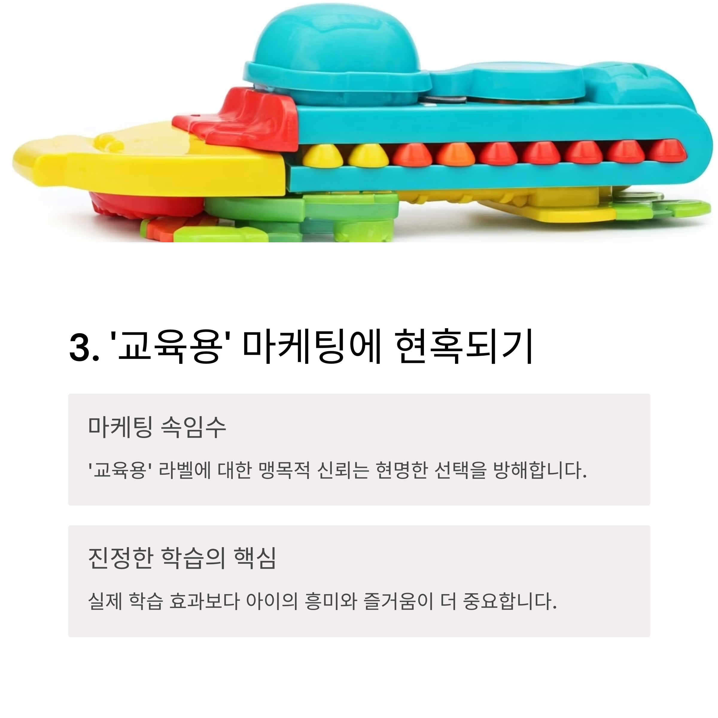 마지막 실수는 ‘교육용’이라는 단어에 속아 장난감을 고르는 것입니다. 교육용 장난감이라는 이름이 붙었다고 해서 모두 아이에게 적합하거나 유익하진 않습니다. 오히려 학습 요소가 너무 강조된 장난감은 아이에게 재미보다 부담을 줄 수 있습니다. 장난감은 기본적으로 ‘놀이’가 목적이며, 즐거움을 통해 자연스럽게 배우게 하는 것이 중요합니다. '재미' 없는 교육은 아이의 흥미를 떨어뜨리고, 결국 사용되지 않는 장난감이 되어버릴 가능성이 높습니다.