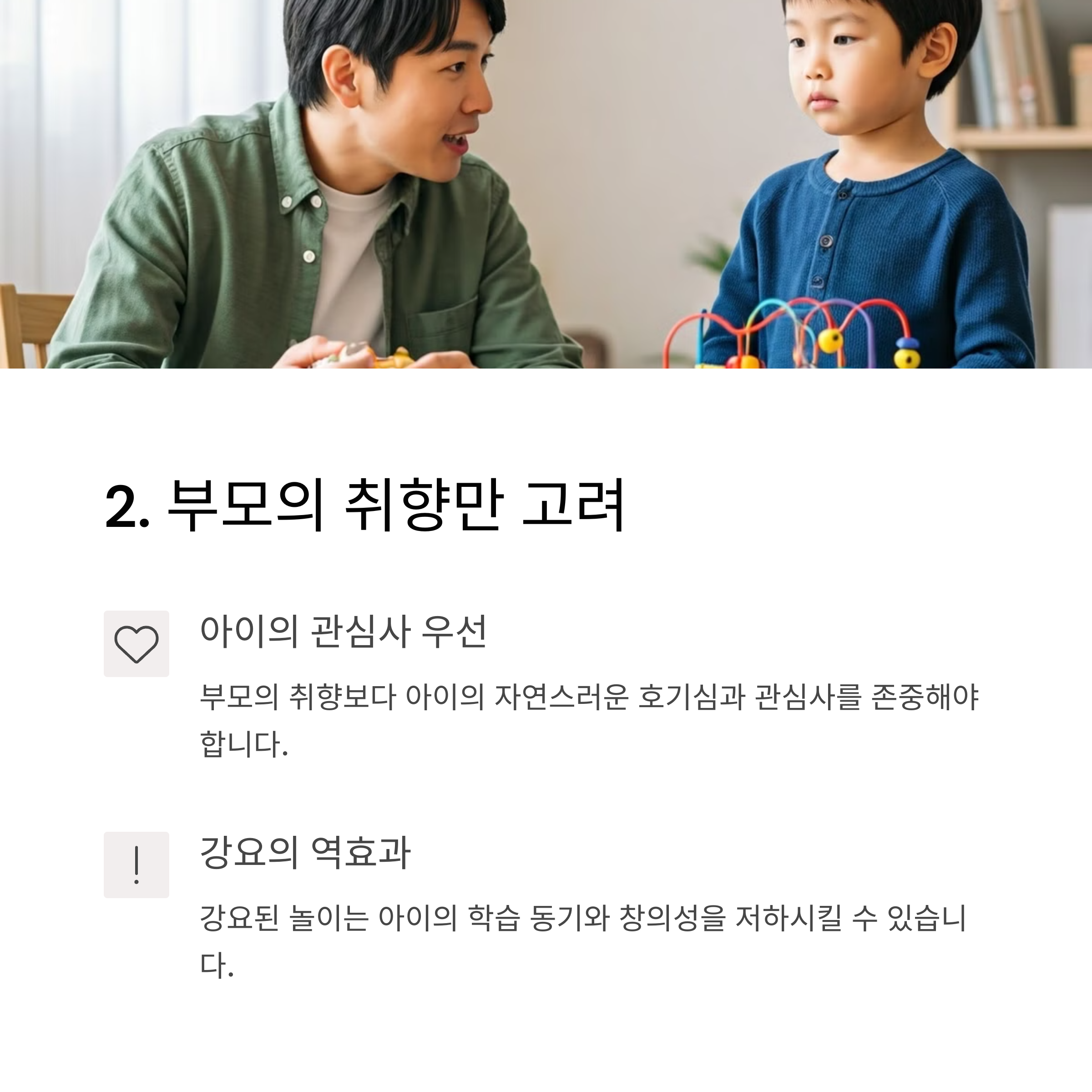 | 부모의 착각 | 아이가 좋아할 거라는 추측만으로 결정하는 실수 |