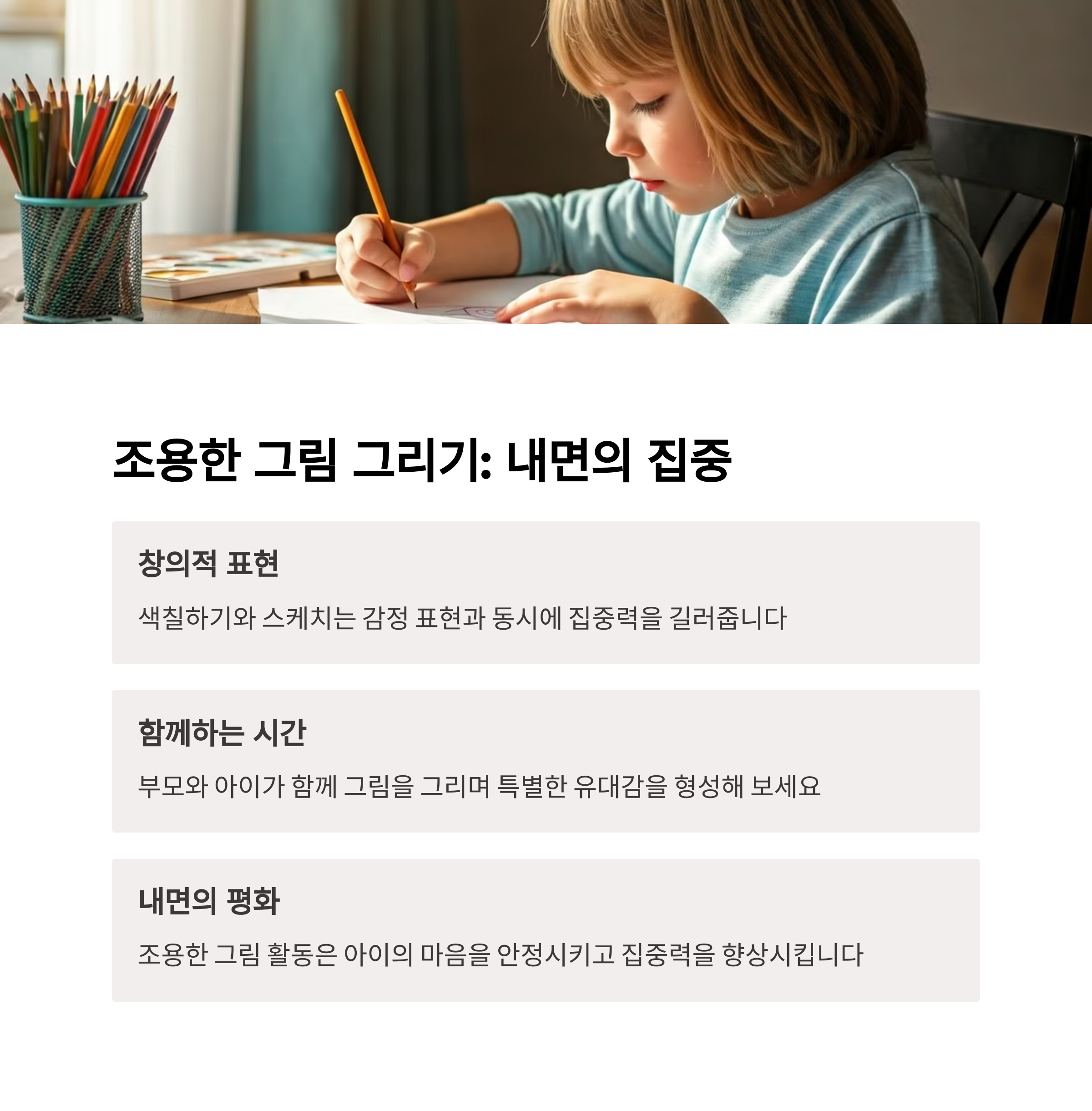 두 번째는 '조용히 그림 그리기'입니다. 놀이는 무조건 시끄럽고 활발해야 한다는 고정관념을 버려야 합니다. 조용한 음악을 틀어놓고, 자유롭게 그림을 그리게 하세요. 이때 주제는 정하지 않아도 좋습니다. 단, 10분 이상 그리기에 집중할 수 있도록 방해 요소를 최소화해 주세요. 집중력이 약한 아이도 '한 가지 활동에 몰입하는 연습'을 통해 서서히 변화하게 됩니다.