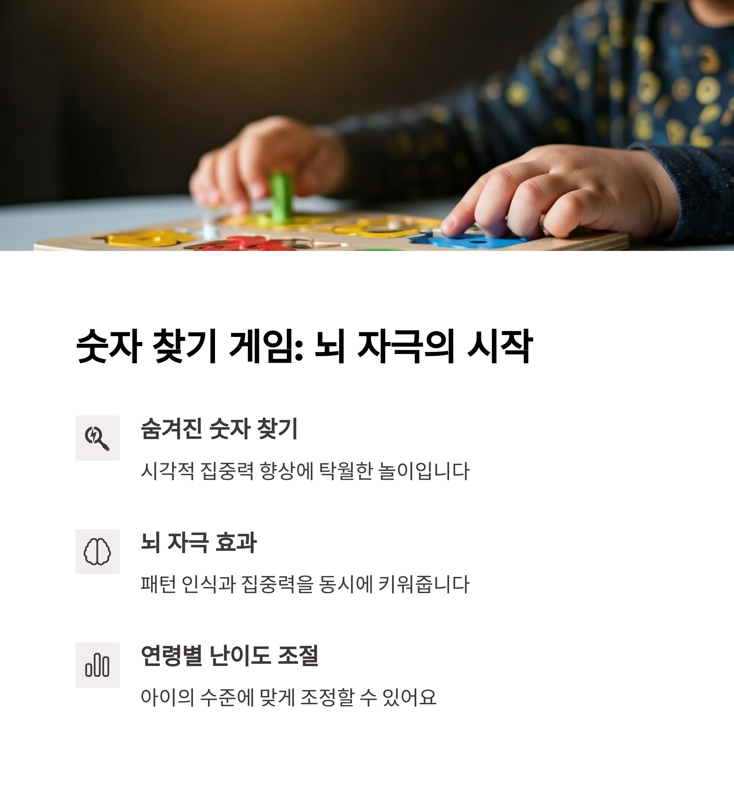 | 놀이를 통한 집중 훈련 | 감각과 두뇌 동시 자극 | 부모와 함께하는 시간 강조 |