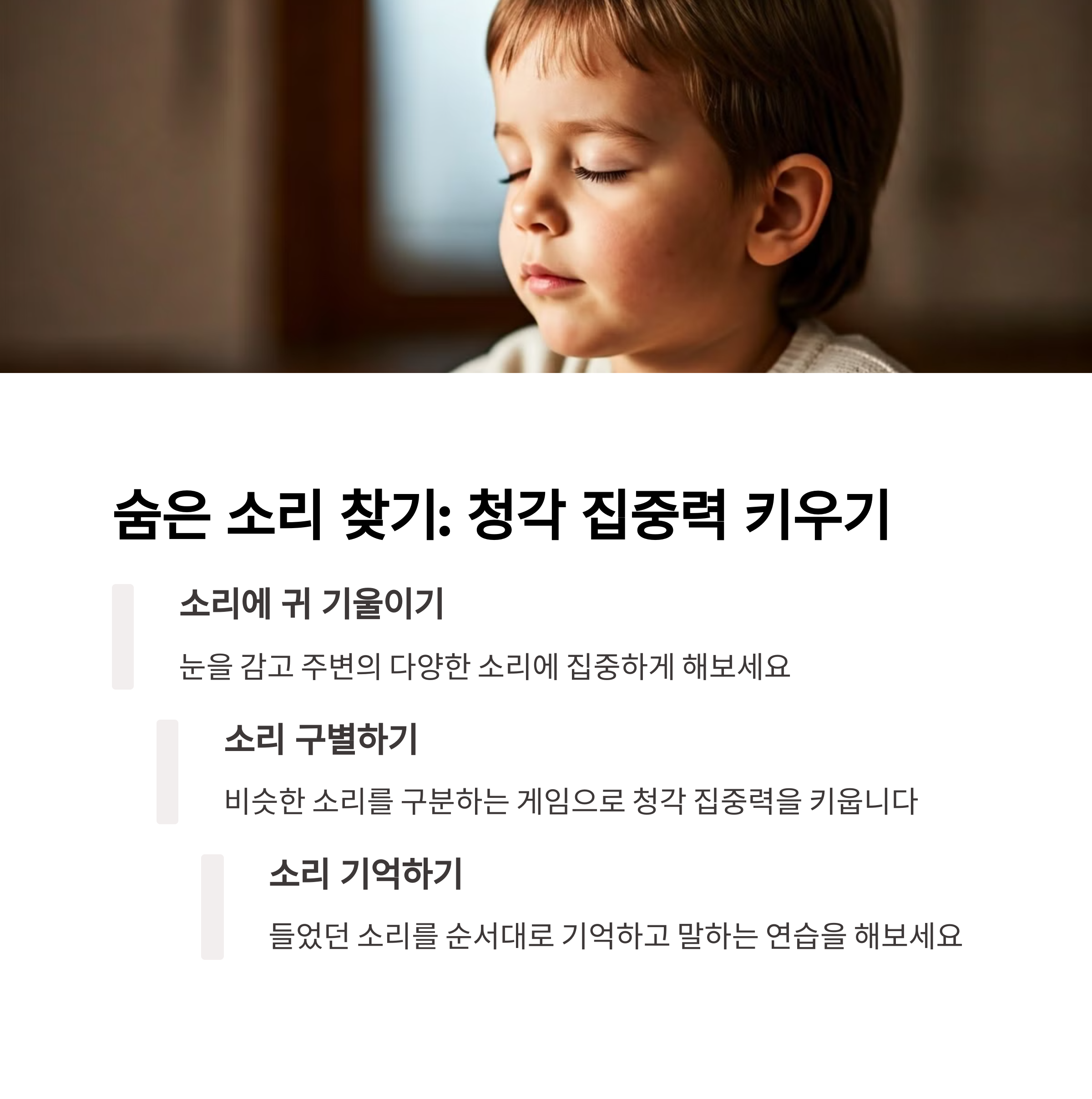 세 번째 놀이는 '숨은 소리 찾기'입니다. 눈을 감고 다양한 소리를 들려주고, 어떤 소리였는지 맞히는 놀이입니다. 냉장고 소리, 시계 초침, 종이 찢는 소리 등 일상 속의 소리를 활용해도 좋습니다. 이 놀이는 청각적 집중력과 상상력을 동시에 키워줍니다. 또한 아이의 감각을 깨우는 데 매우 유용하며 가족이 함께하면 더욱 풍성한 놀이 시간이 됩니다.