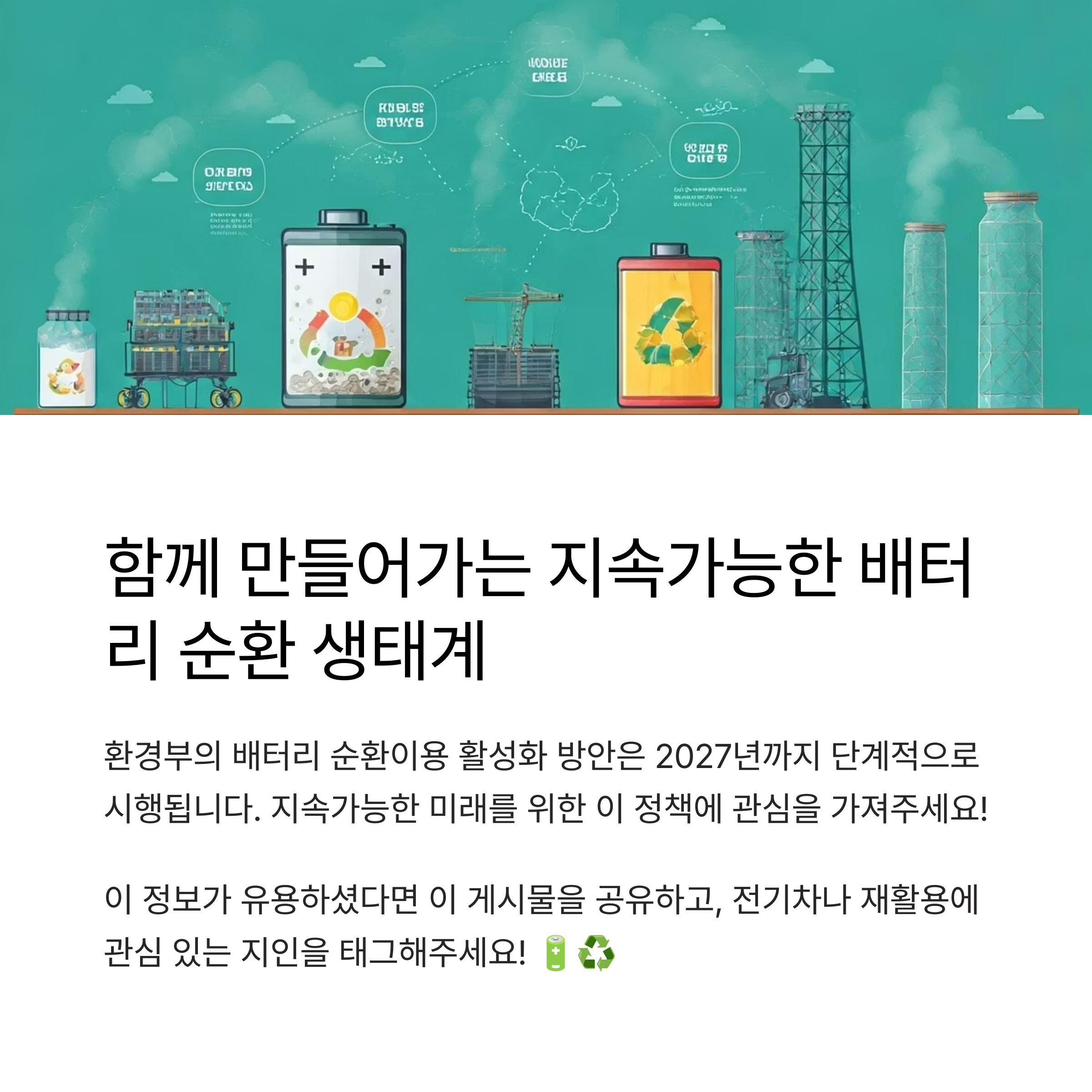 - 성능평가 의무화: 2027년까지 전기차 사용 후 배터리 성능평가를 의무화하여 잔존가치에 따른 고부가가치 활용을 극대화합니다.