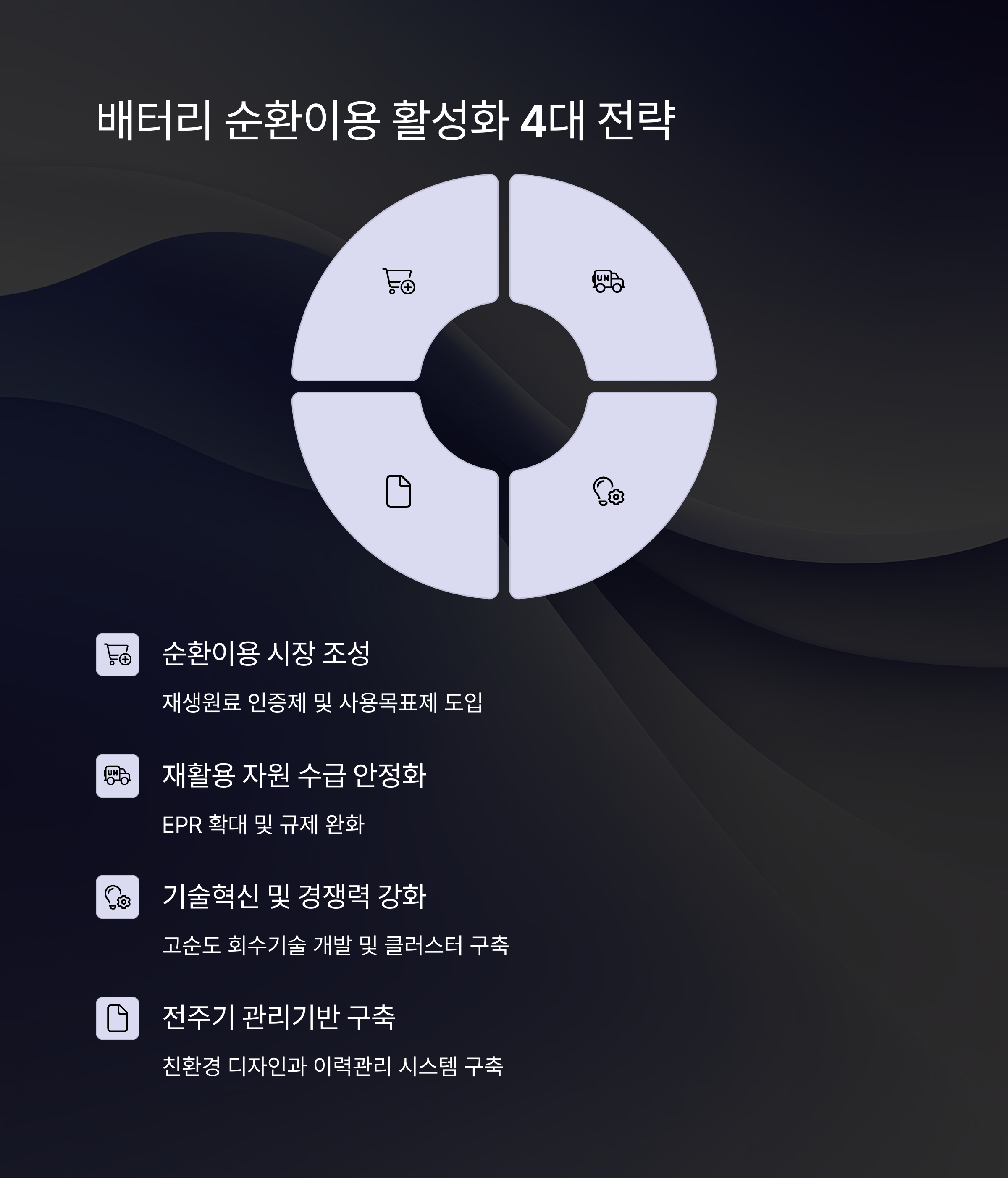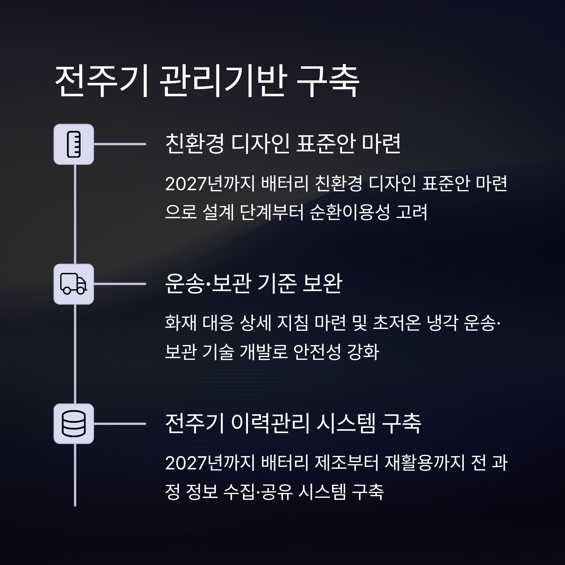- 전주기 이력관리 시스템 구축: 2027년까지 배터리 제조부터 사용, 재활용까지 전 과정의 정보를 수집·공유하는 시스템을 구축하여 투명한 거래를 지원합니다.