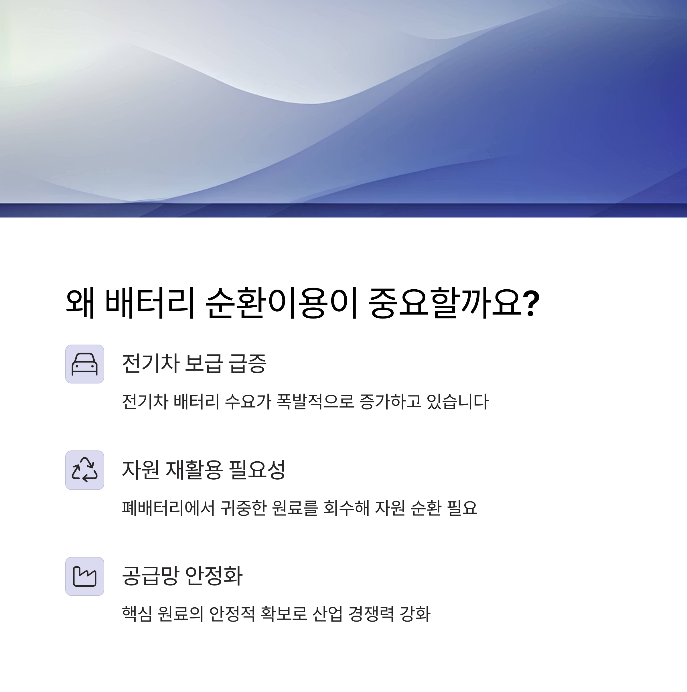 - 재생원료 인증제도 도입: 폐배터리에서 회수한 유가금속을 재생원료로 인증하고, 신품 배터리 내 사용 여부 및 함유율을 확인하는 제도를 2027년부터 시행합니다.