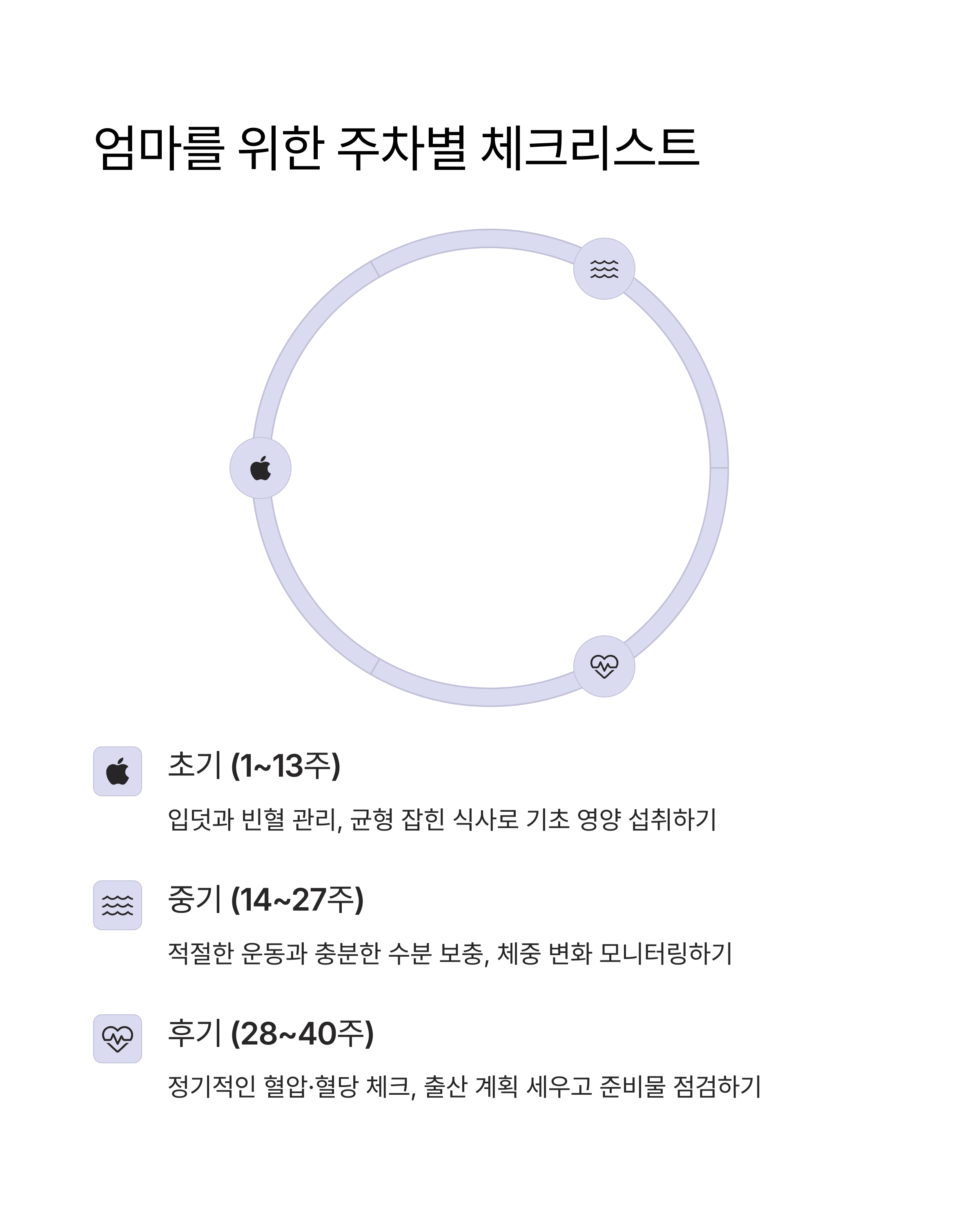 | 임신 주차별 변화 | 태아가 어떻게 주차별로 성장하는지 설명합니다. |