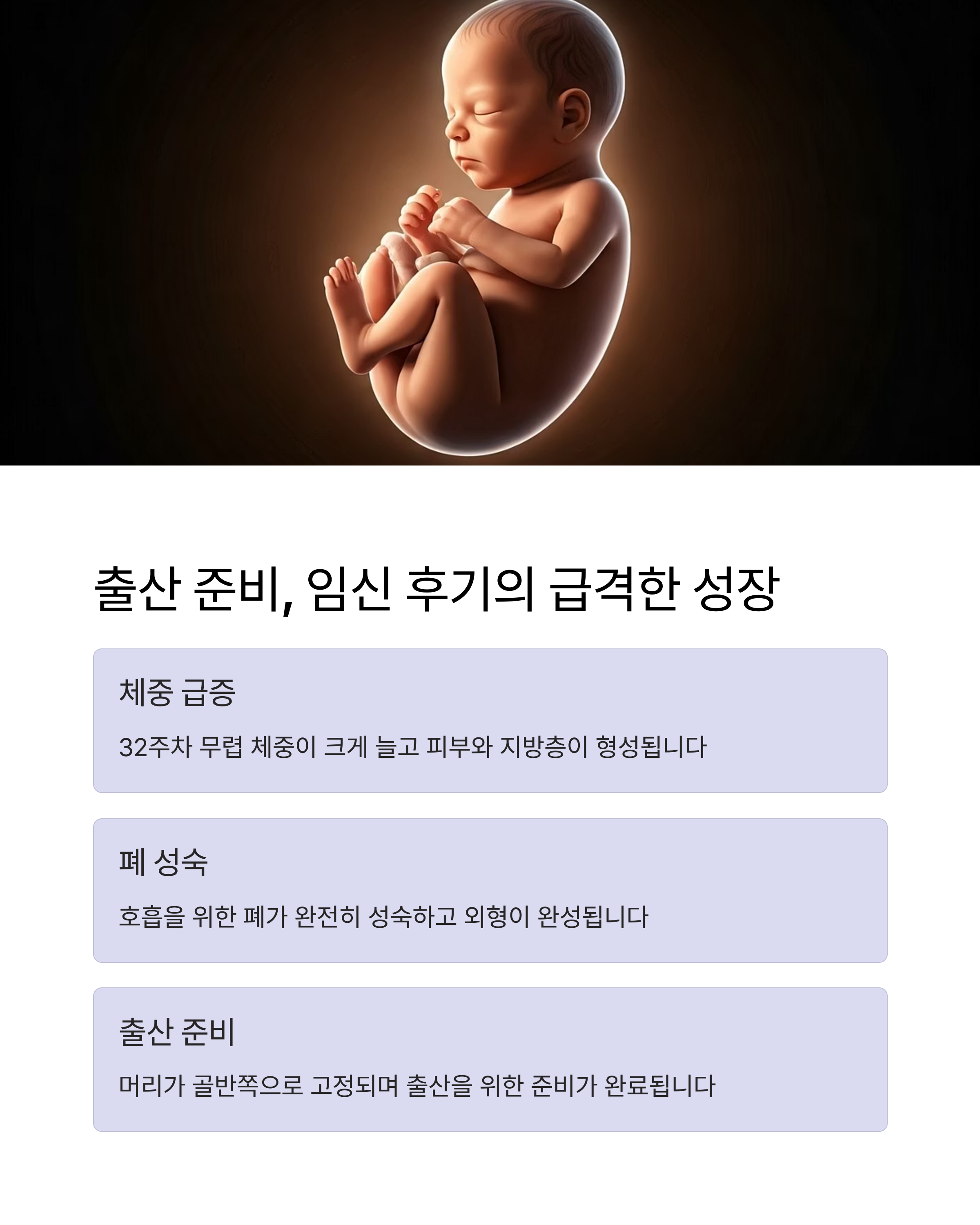 임신 후반기인 21~40주 사이에는 태아의 체중이 급격히 증가하고, 폐, 신장, 간 등 생존에 필요한 주요 기관이 완성됩니다. 특히 30주 이후부터는 아기가 엄마의 목소리에 반응하거나, 빛과 어둠을 구분할 수 있을 만큼 감각이 발달합니다. 36주 이후는 출산 준비 단계로, 엄마의 몸도 산도를 넓히고 호흡 연습을 하게 됩니다. 이 시기의 엄마는 가벼운 걷기 운동과 충분한 수면으로 체력을 비축하는 것이 무엇보다 중요합니다.