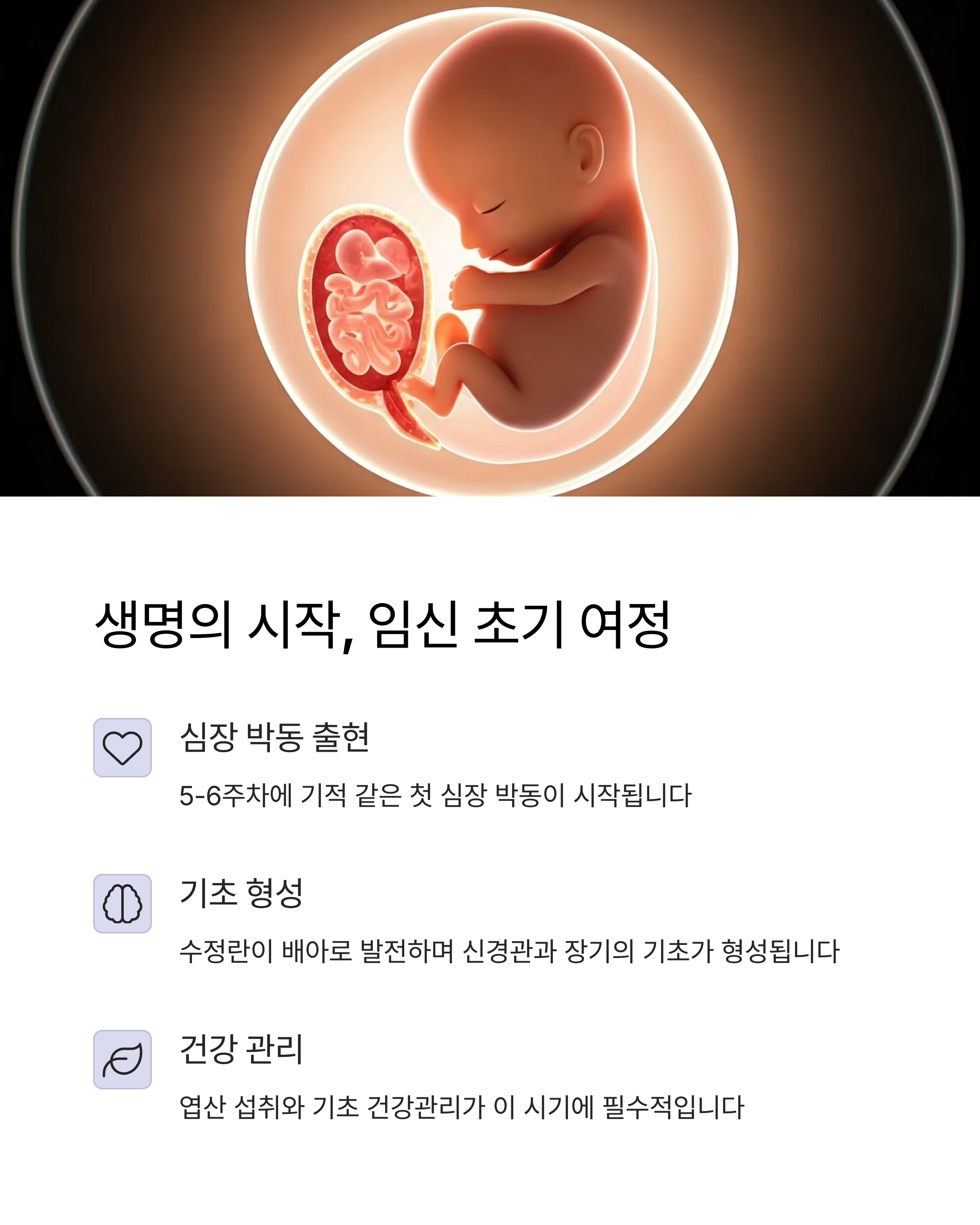 임신 1주차는 생리가 끝난 직후로, 실제 수정은 아직 이루어지지 않은 상태입니다. 2주차가 되면서 배란이 일어나고, 정자와 난자가 만나면 수정이 시작됩니다. 3~4주차엔 수정란이 자궁에 착상되며, 엄마 몸에서도 호르몬 변화가 급격히 일어나 가슴이 민감해지거나 미열, 피로감을 느낄 수 있습니다. 5주차에는 태아의 심장이 박동하기 시작하며, 6~8주차부터는 팔과 다리의 기초가 형성됩니다. 이 시기부터 입덧이 시작되며, 감정 기복도 커지므로 충분한 휴식과 스트레스 관리가 중요합니다.
