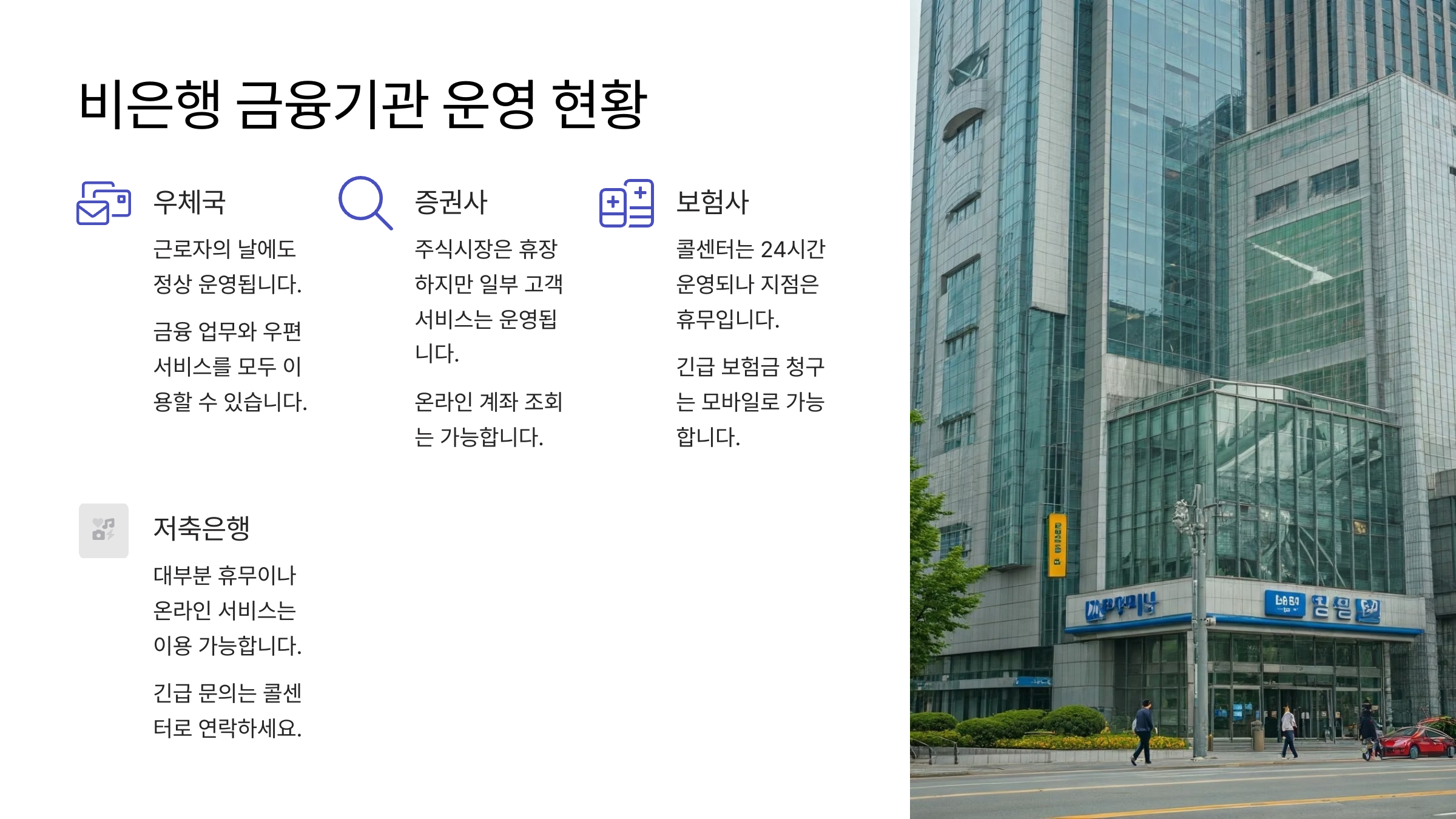 5월 1일 근로자의 날에는 대부분의 은행이 휴무지만, 일부 지점은 자율적으로 운영되므로 거래가 필요한 분들은 사전 확인을 통해 불편을 줄일 수 있습니다. 특히 부동산 계약일, 급한 송금, 법인 일정 등이 있다면 모바일 뱅킹이나 대체 채널을 적극 활용해보세요. 사전에 준비하면 공휴일에도 큰 문제 없이 금융 업무를 처리할 수 있습니다.