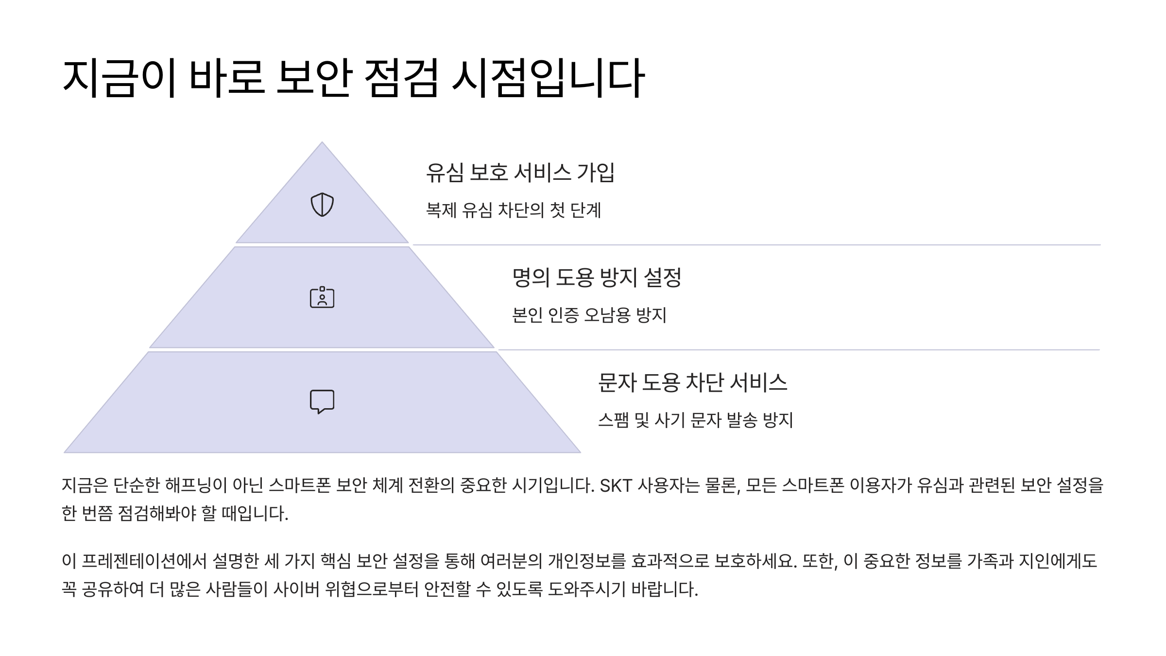 | 유심 복제, 번호 도용, 인증 탈취 | 유심 보호 서비스, 명의도용 방지, 문자 차단 | 즉시 설정 & 유심 물리 교체 |