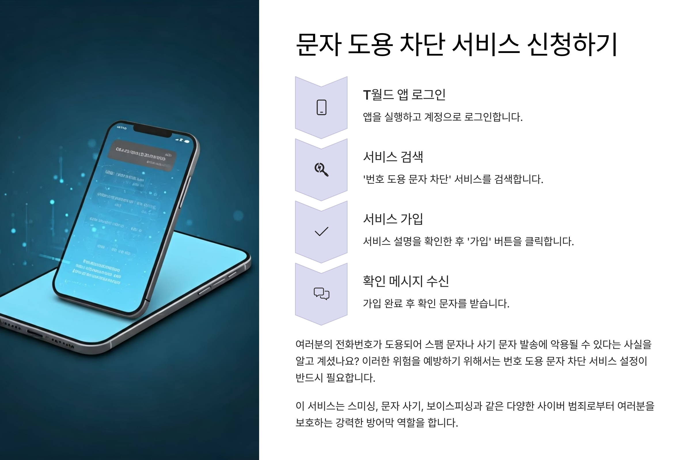 - T월드 앱 로그인 → '번호 도용 문자 차단' 검색